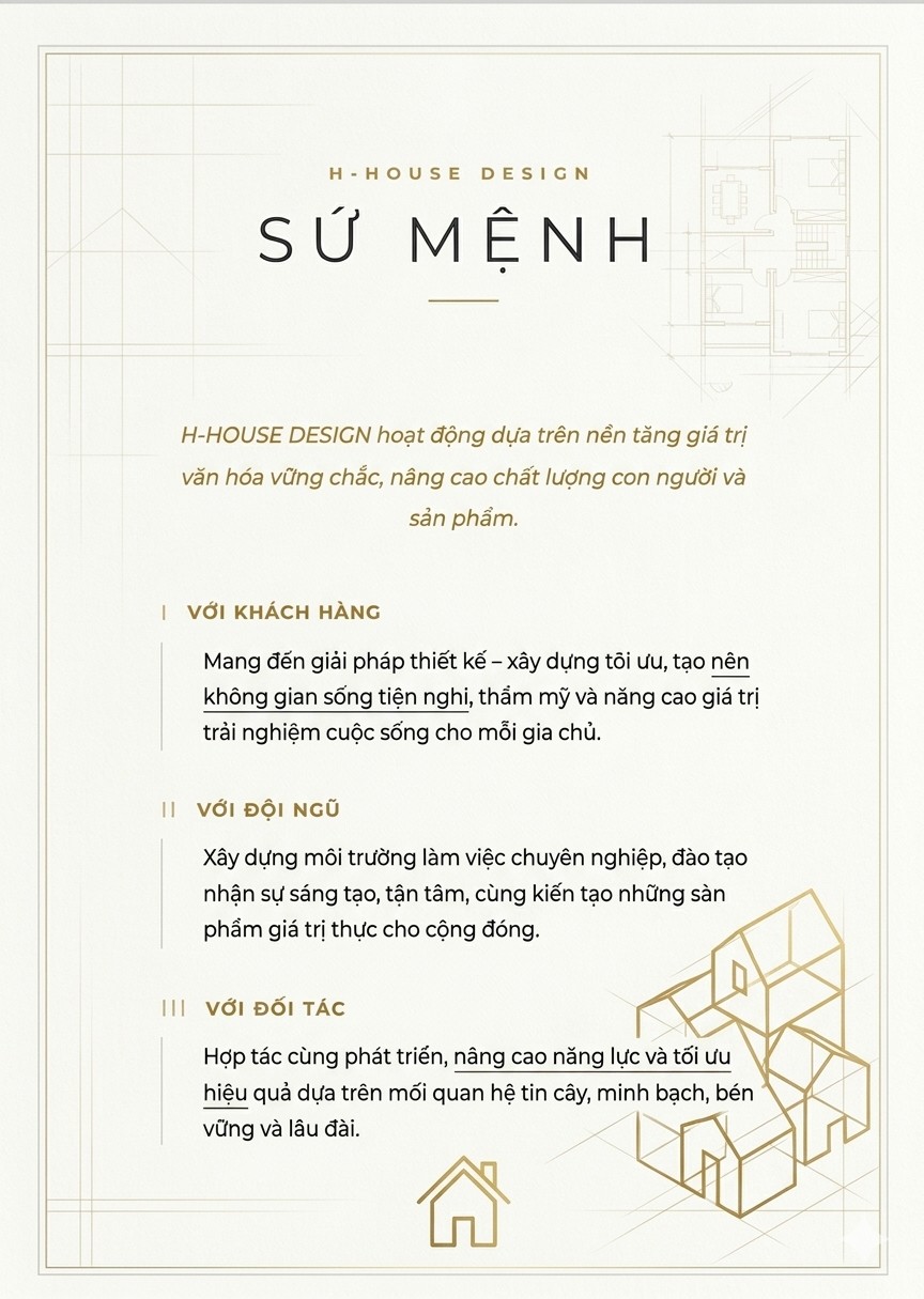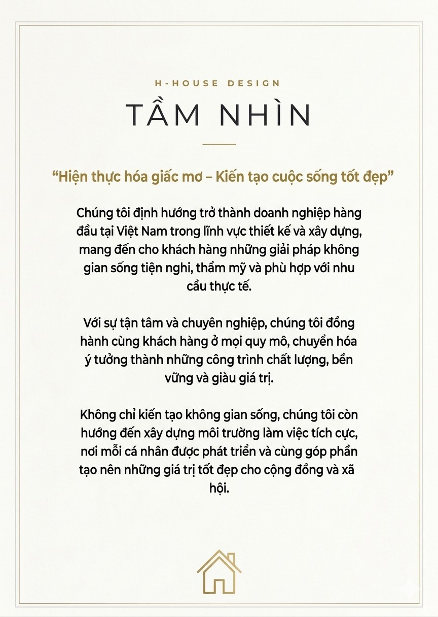 Với đội ngũ giàu kinh nghiệm và sáng tạo, H House Design không ngừng đổi mới để kiến tạo những giá trị bền vững – khác biệt – đẳng cấp.